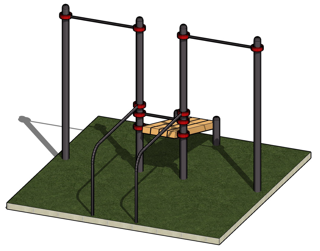 К опорным столбам высотой 2600мм крепится перекладина турника длинной 1200 мм на высоте 2400 мм и шведская стенка. Шведская стенка шириной 1200 мм, ширина секции 340 мм. Скамья для пресса фиксируется на высоте 1300 мм при помощи хомутов. Скамья для пресса представляет собой брус сечением 1800*450*45 мм. Общая длина комплекса составляет не более 3100 мм.
