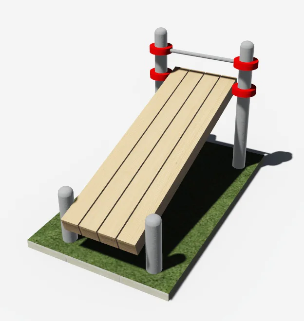 К четырем опорным столбам высотой: 2 шт. – 550 мм, 2 шт. – 1400 мм при помощи хомутов крепится скамья. Высота фиксации скамьи составляет: 1100 мм и 400 мм от уровня основания. Перекладина для фиксации ног крепится на высоте 1300 мм от поверхности основания. Лавка представляет собой деревянный брус размером 450мм*1800мм сечением 140*50 мм. Крепление элементов комплекса осуществляется при помощи хомутов. Длина скамьи в собранном виде составляет не более 1600 мм.