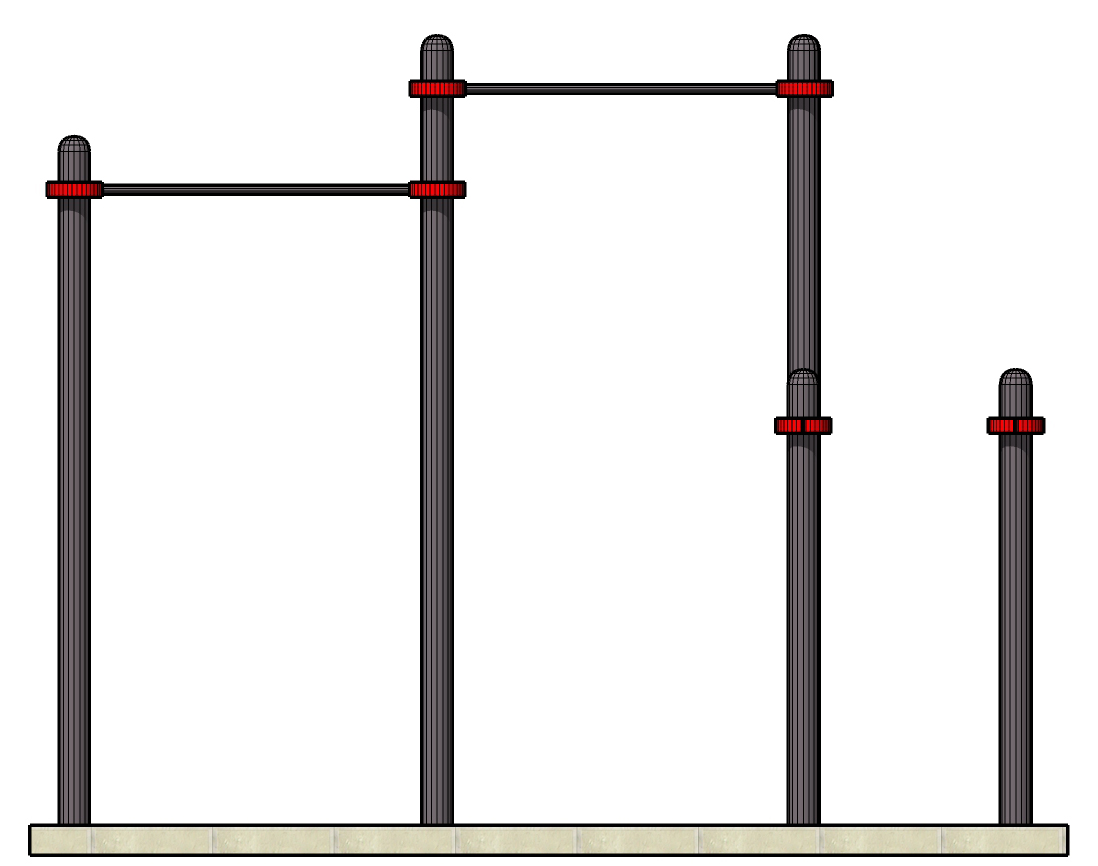 К опорным столбам высотой 2600мм, 2300мм в крепится с помощью хомутов на высоте от уровня основания: 2550 мм, 2400 мм перекладины турника шириной 1200 мм, брусья фиксируются на высоте 1400-1500 мм от уровня основания.